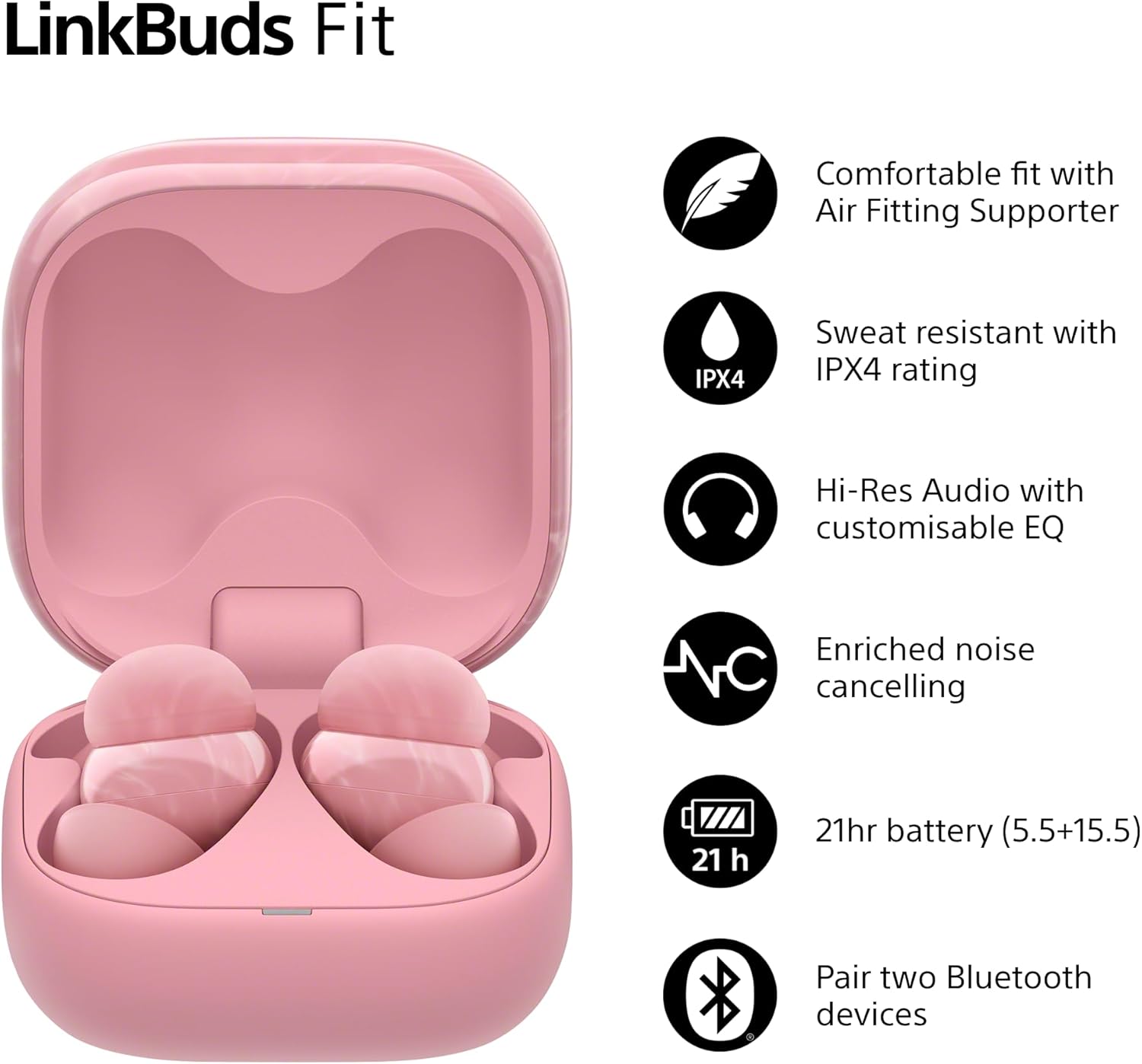 Introducing LinkBuds Fit: Weighing just 4.8g, these earbuds provide ultimate comfort, with an innovative new air cushion to ensure a secure fit – whatever you’re doing. As they’re water resistant, sweat nor rain can hold you back.